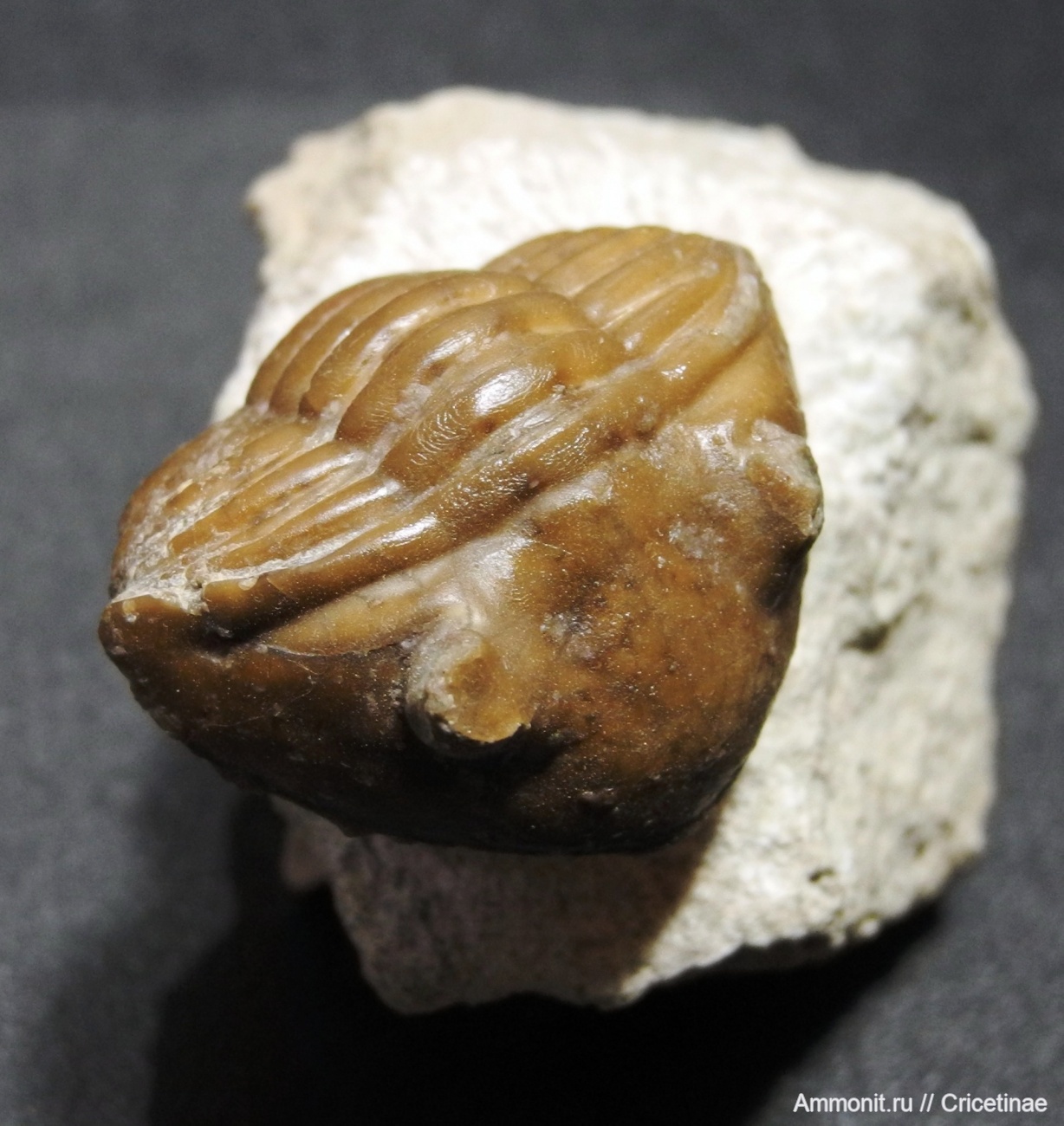 Свёрнутый трилобит Asaphus. Размер трилобита 3,5 см. На рахисе видны "морщинки".