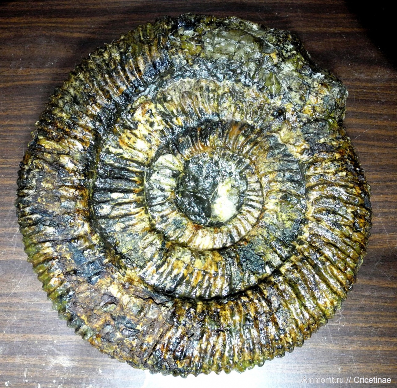 Размер 32 см. Аммонит уже "переболевший" пиритовой болезнью и превратившийся из пиритового в гипсово-лимонитовый, но при этом не разрушившийся. Аммонит покрыт парафином и лаком.