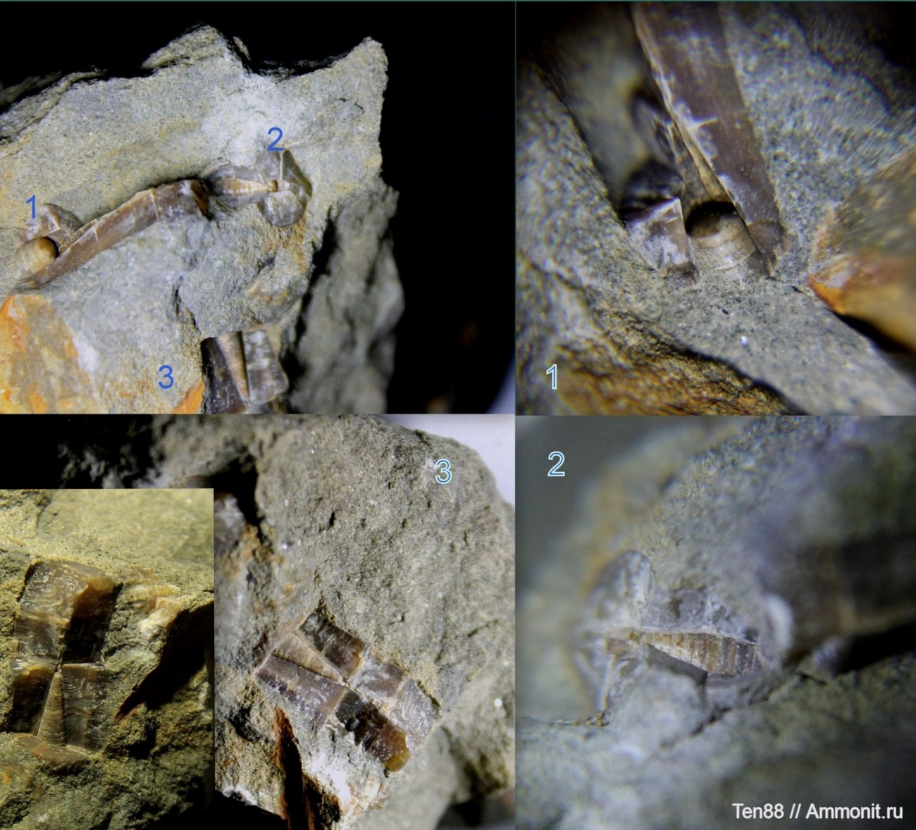 В небольшом фрагменте породы ( 4.5 х 4.8 см.) Фото, обнаружилось сразу 3 фрагмокона. Конечно не все целые, но зато они есть :). 1-й - 3 мм, 2-й - 5 мм, 3-й - 5 мм.