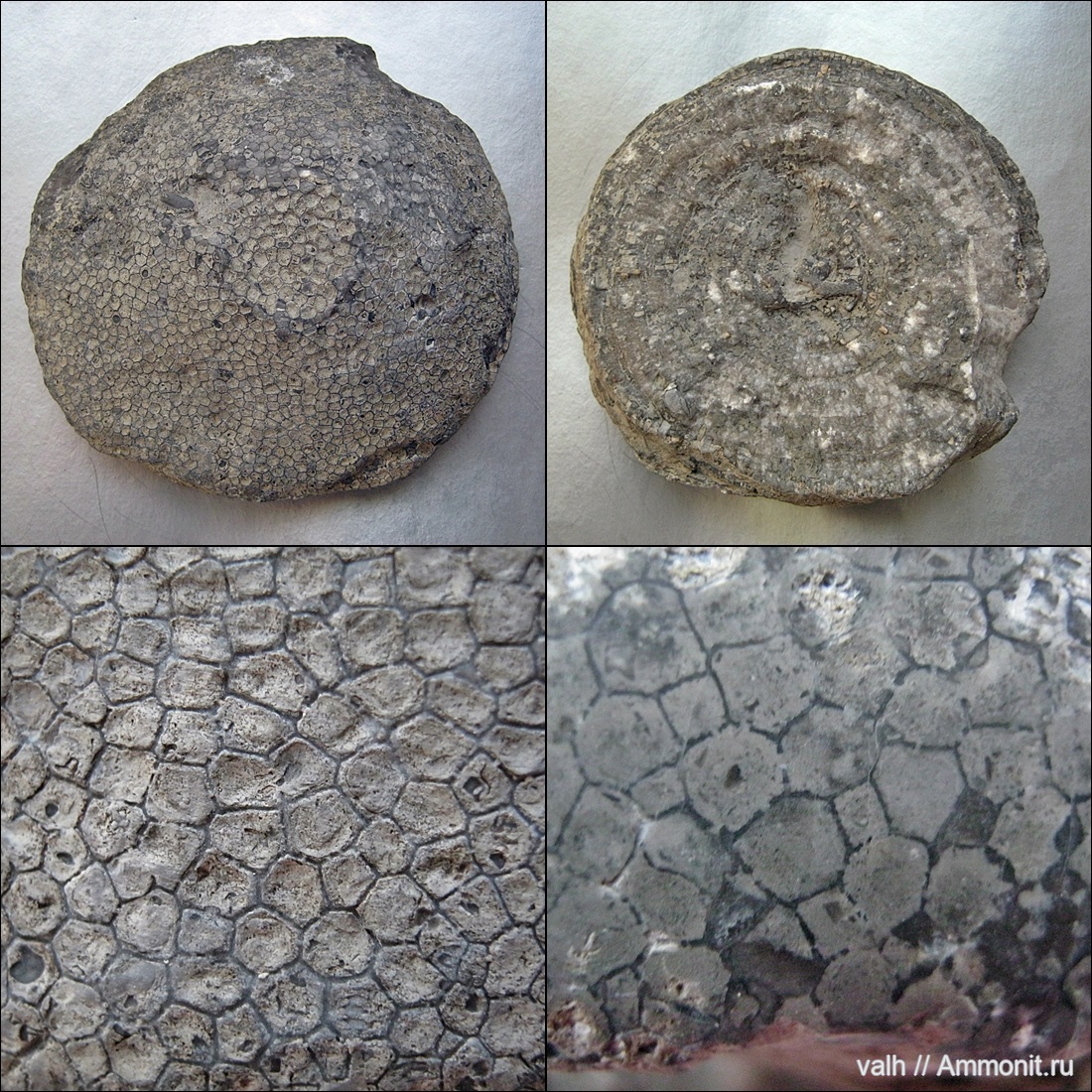Кораллиты радиально расходятся от центра колонии. Размер кораллитов преимущественно от 2,0 до 3.0 мм.Стенки тонкие,слегка искривлённые. Шипики отсутствуют. Поры просматриваются на гранях кораллитов.Горизонтальный срез фрагмента колонии - внизу справа.