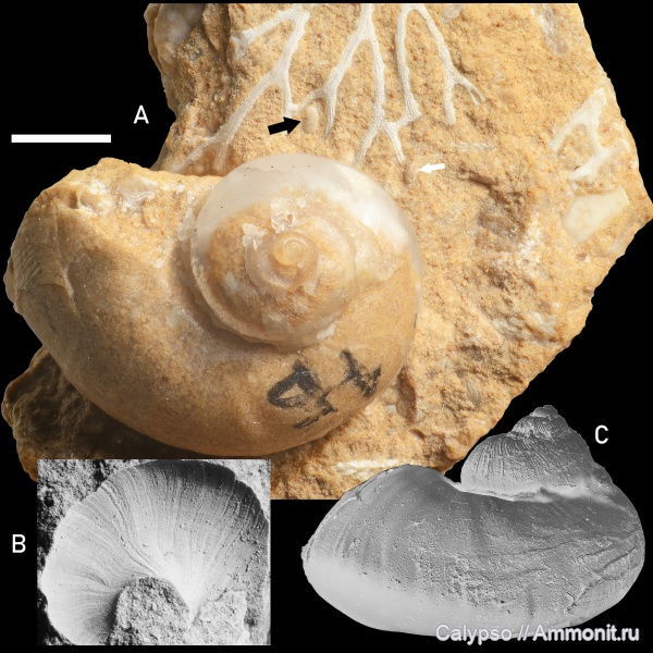 На штуфе так-же имеются остракоды (показаны ч/б стрелками) и ветвистая колония мшанки Chasmatopora furcata (Eichwald, 1854).