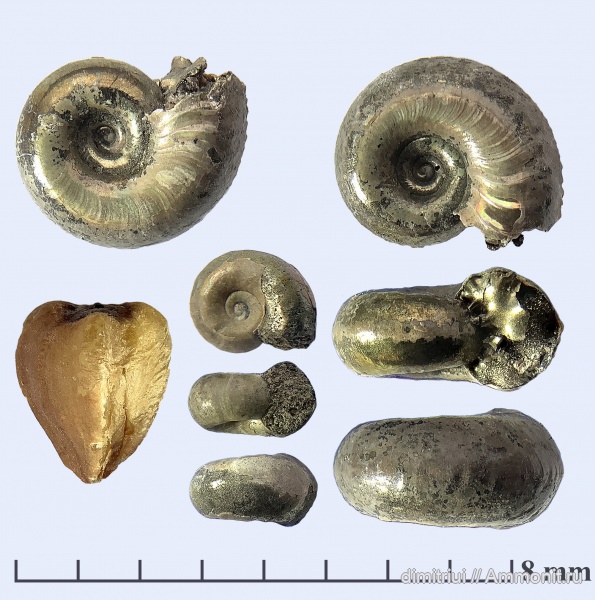 Замечательно! Эти аммонитята как раз на переходе от гладкой стадии (которая обычно присуствует у всех аммонитов в большей или меньшей степени) к появлению скульптуры. А чем фотографировали, если не секрет? | ||||||
