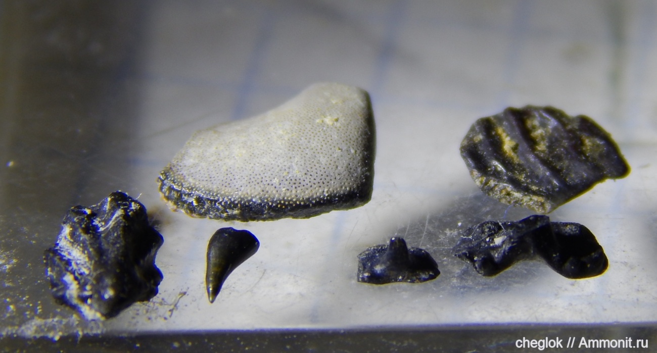Несколько кило породы из старых Песков, со стены, там, где поболее фауны, так что отмой-раствор чуть не на 100% состоял из фоссилий, и вот немногочисленный результат. Пара гликманиусов, вроде кусок дельтодуса, пара загадочных вроде покровных элементов, зуб вроде костной рыбы. Всё мелкое, от трёх до семи мм.