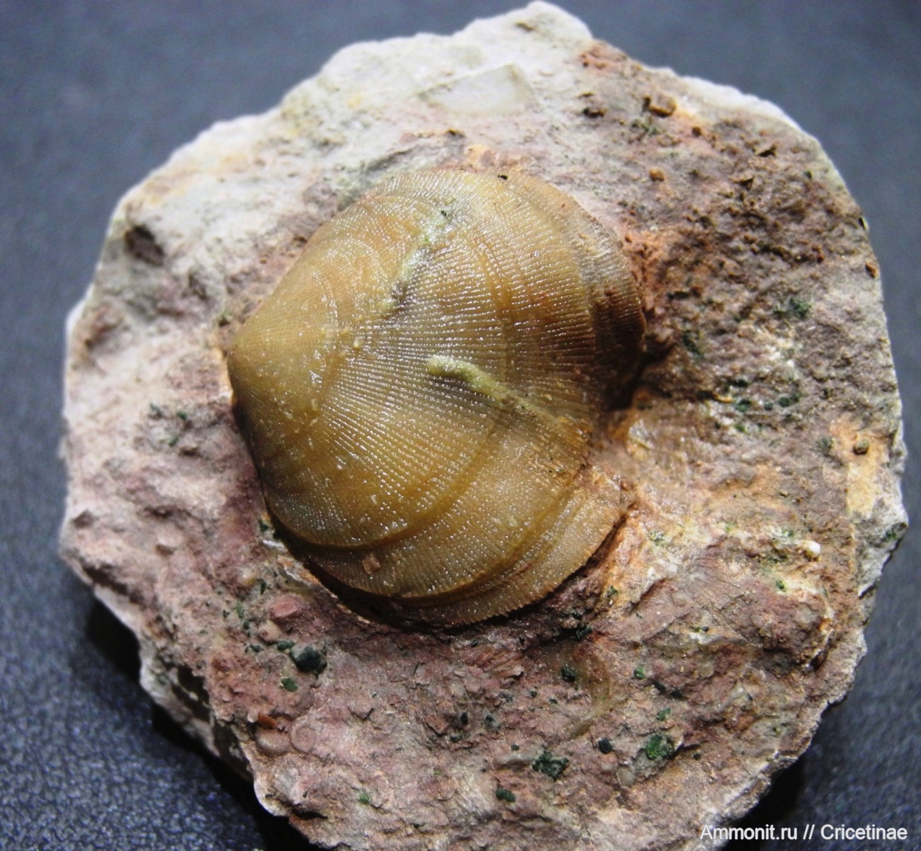 Porambonites reticulatus в породе, с обрастанием. Размер брахиоподы 2,4 см.