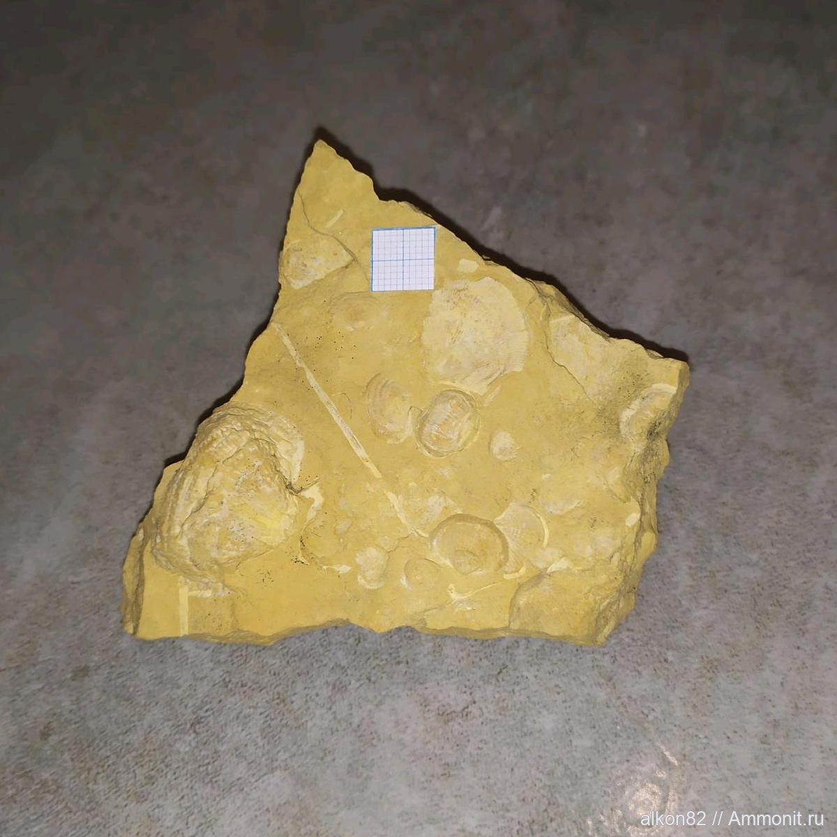 Плитки со скоплением различных брахиопод нередкие в Русавкино, но на этой плитке в 3х местах есть тоненькие палочки, скорее всего, какие-то водоросли, на сколе видно четкое сплющенное овальное сечение, в середине типа проводящего канала, на чьи-то следы не похоже, на что-то подвижное из карбоновых обитателей тоже не похоже.