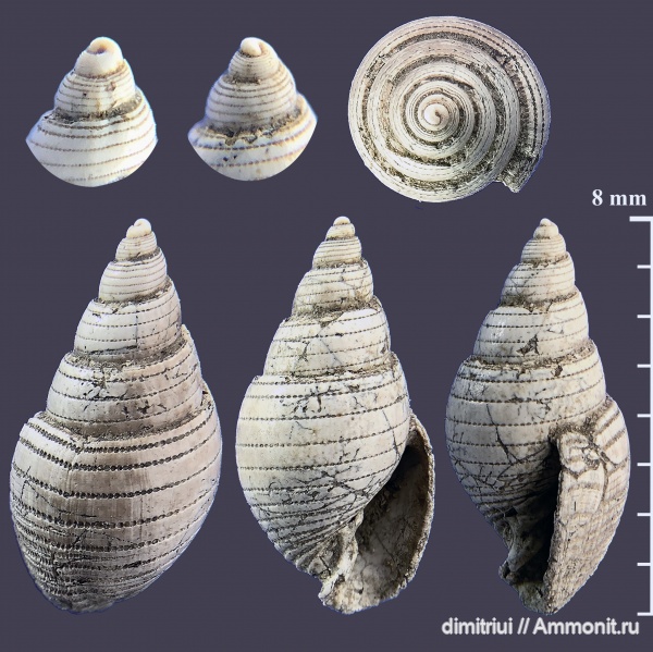Очень долгое время хотелось найти эту гастроподу, но в Песках и Бронницах она мне так и не попалась (хотя находки оттуда нередки), зато повезло найти несколько штучек в Тимонино. Очень примечательно то, что у нее сохранились начальные обороты - их проекции я сфотографировал с большим увеличением и поместил в левую часть фотографии.