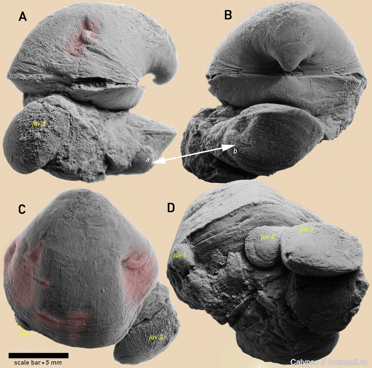 Растушёвкой розового цвета показаны области прижизненного повреждения раковины (теснота поселения) - вмятины и концентрические борозды.