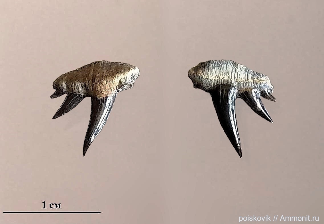 Зуб акулы (в 2-х проекциях) из верхне-барремских отложений в окресностях села Верхоречье