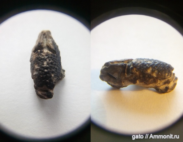 В принципе, всегда думал, что это запчасть от рака, но только сейчас с увеличением рассмотрел характерные пупырышки. К сожалению, это все, что осталось - с другой стороны типичная белая "рачья" порода (мергель?) как в Ракообразное, Eryma sp. , Головогрудь рака и др. Размер 12 мм.