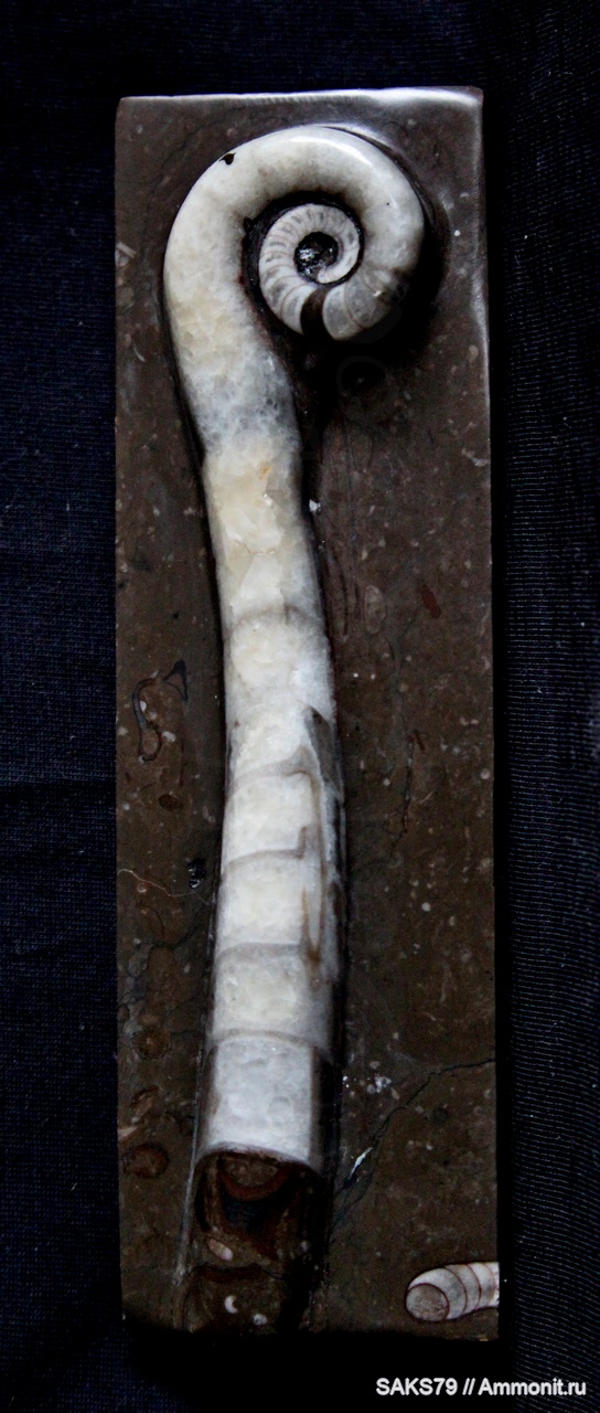 Lituites tenuiculatus (т.н. "папский посох"). Тарфицериды (Tarphycerida) - отряд головоногих моллюсков подкласса Nautiloidea. Данный образец предположительно из отложений среднего ордовика (480-450 млн.лет), территория современной КНР. Замещение кальцитом. Размеры матрицы 14,5x4,5 см.