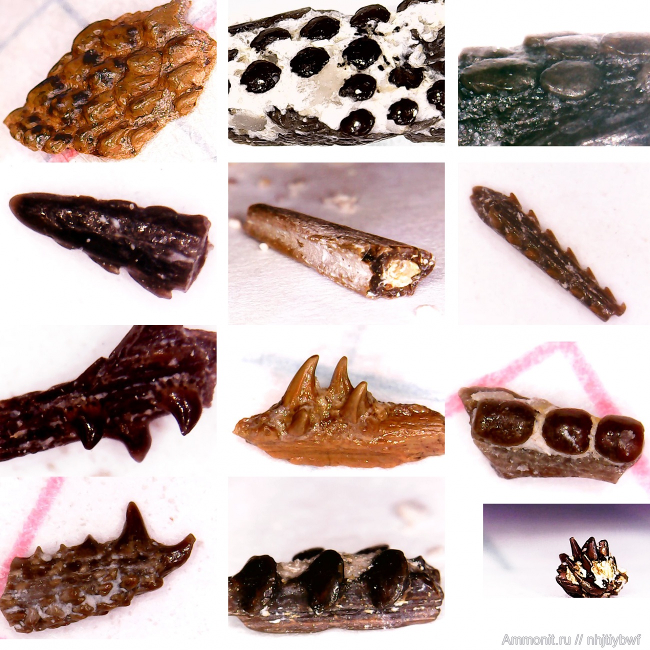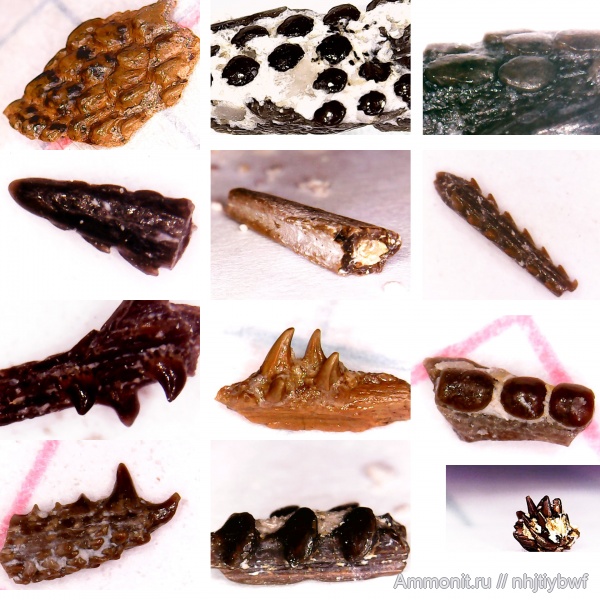 Надо сказать, не известно, к каким рыбам принадлежали конкретно эти "грибочки" и "кирпичики". С остальными понятнее: второй ряд - среднее фото похоже на шип ската? Первое фото шип ксенаканта? Во втором ряду третий Bransonella? Только я не пойму: зубки Bransonella миллиметровые встречаются, а шипы большие? Шип Bransonella lingulata Ivanov & Ginter, 1996
