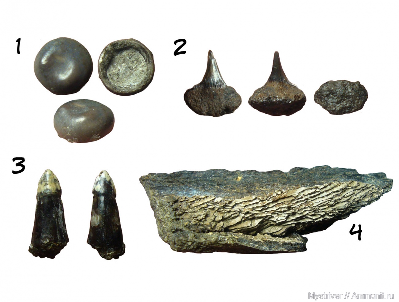 1 - зуб рыбы из отряда Pycnodontiformes (Капотня, зона virgatus)