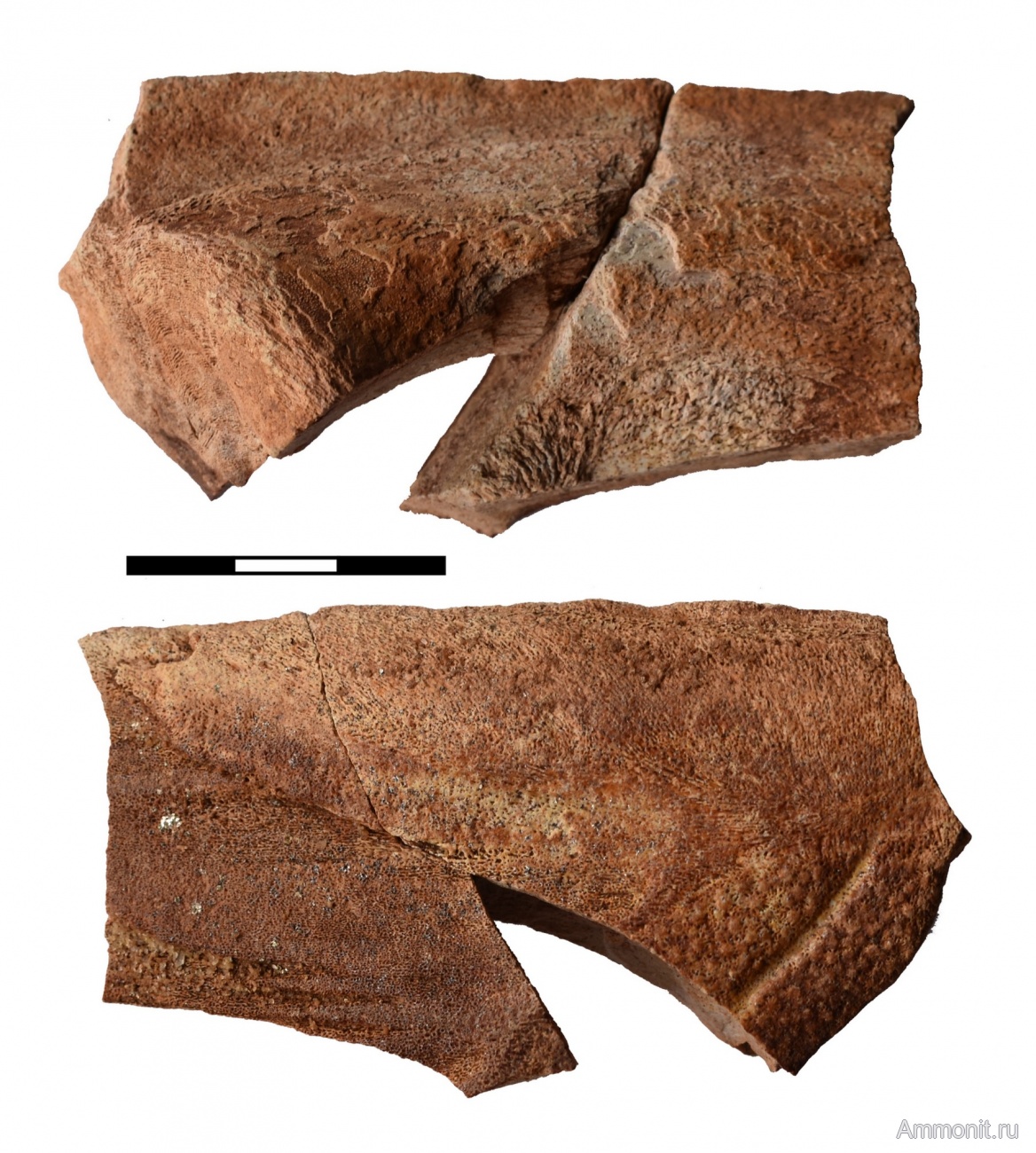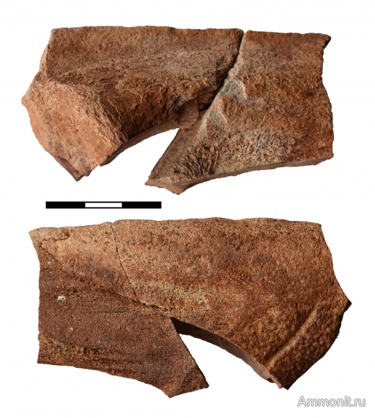 Прошу помощи в определении. Фрагмент щитка плакодермы? Размеры 8,6х4,7, макс.толщина 3 см. Склеен из двух фрагментов. Найден в осыпи обнажения красных песчаников (арукюлаская свита среднего девона?)в карьере рядом с д. Хотнежа Волосовского района Ленинградской области.