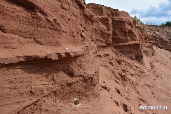 Обнажение красных песчаников (арукюлаская свита среднего девона?) в карьере рядом с д. Хотнежа Волосовского района Ленинградской области. В нижней части разреза торчит глинистая конкреция.