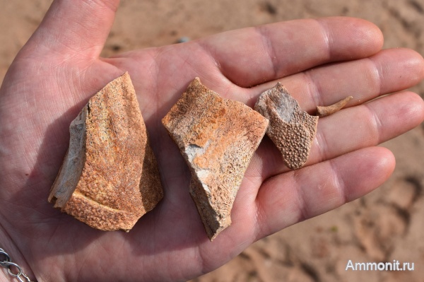 Часть находок в осыпи обнажения красных песчаников (арукюлаская свита среднего девона?)в карьере рядом с д. Хотнежа Волосовского района Ленинградской области. В том числе вот этот https://www.ammonit.ru/user/brennuvargr/foto/65701.htm неопределенный щиток и этот https://www.ammonit.ru/user/brennuvargr/foto/65703.htm зуб Holoptychius sp.?
