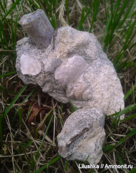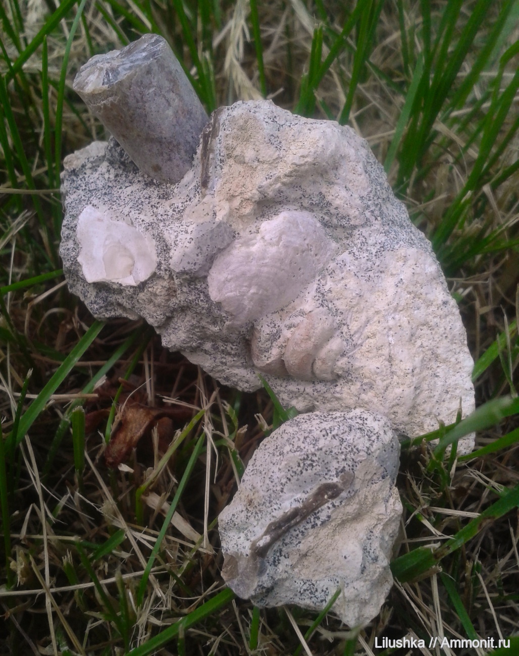 В одном куске породы - губка, белемнит, двустворчатый моллюск, гастропода и зуб рыбы.