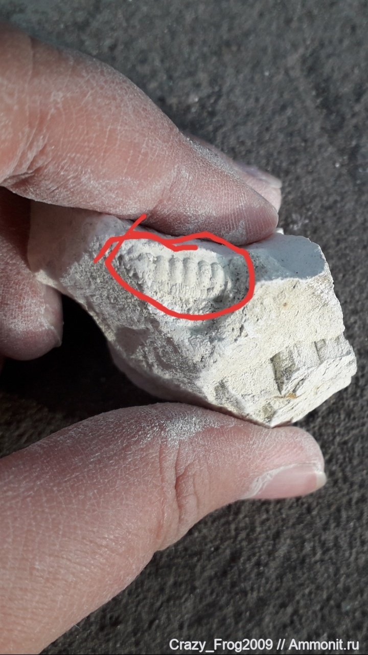 Когда я только нашёл этот кусочек мела,я подумал что там виднеется смычной край иноцерамуса, (в этом месте довольно много иноцерамусов) но пригляделся и понял что это не он.