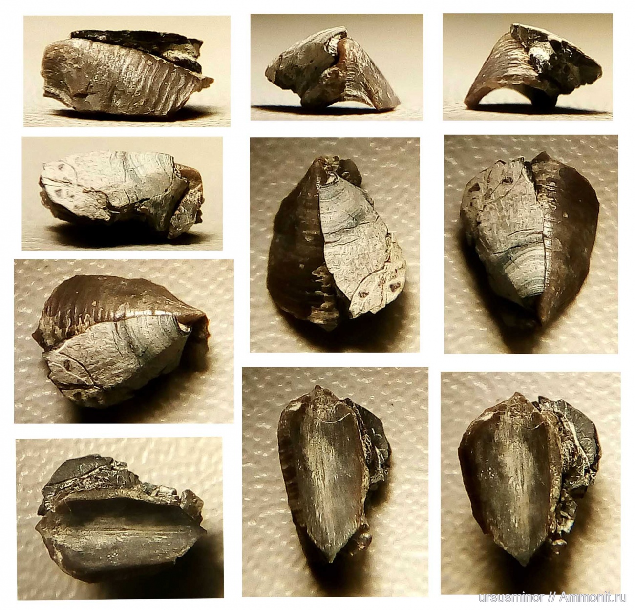 Видно кальцитовое "ушко" на переднебоковом крае конхоринха - под него заходил край органической части челюсти. Вероятно, "ушко" - это часть соединения кальцитовой "рукоятки" конхоринха с его тонким (и тоже кальцитовым) "капюшоном", прикрывавшим часть органики (как у этого образца из крымского берриаса).