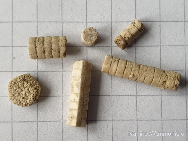В одном месте попадаются разные виды морских лилий (см. другие фото этой галереи). Правда, крупных фрагментов лилий этого вида (пятигранные) не попадалось. Макс. диаметр попадался 7 мм (на фото слева внизу)