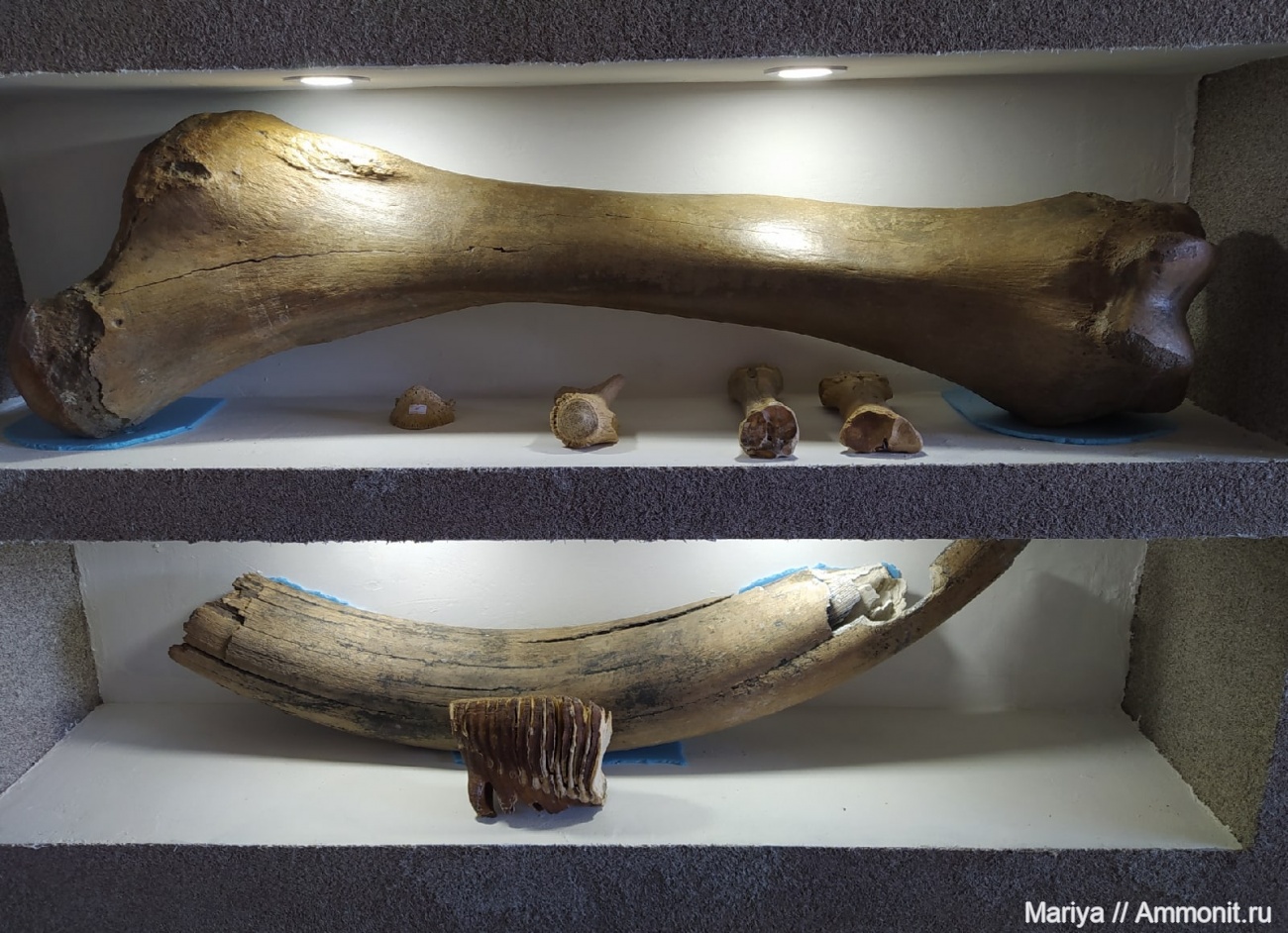 Размещены бедренная кость, бивень и зуб шерстистого мамонта, а также костный материал плейстоценовых копытных.