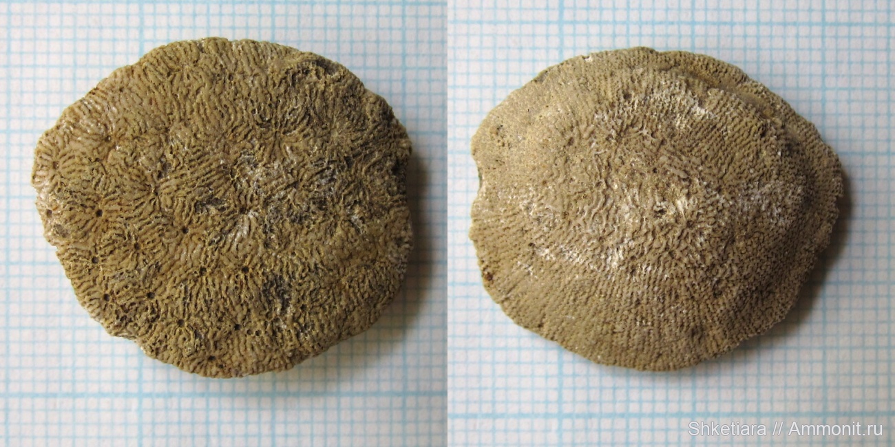 "Лепешка" коралла из Тимонино. Увы, фотоаппарат и навыки не дают мне его сфотографировать технически качественно, информативно и вдобавок еще красиво. Красотой снимка пришлось пожертвовать. Форма образца напоминает шляпку зрелой сыроежки. Верхняя сторона (изображение слева) почти плоская. У нижней стороны (изображение справа) выпуклость более выражена, это немного заметно по светотеням. Максимальная толщина "лепешки" около 9 мм. Вероятно, Thamnasteria sp. Находка из старого отвала, я ничего не могу сказать о вмещающей породе и не дерзну сделать четкий выбор между оксфордским и келловейским ярусами. Буду ждать комментариев знающих людей.