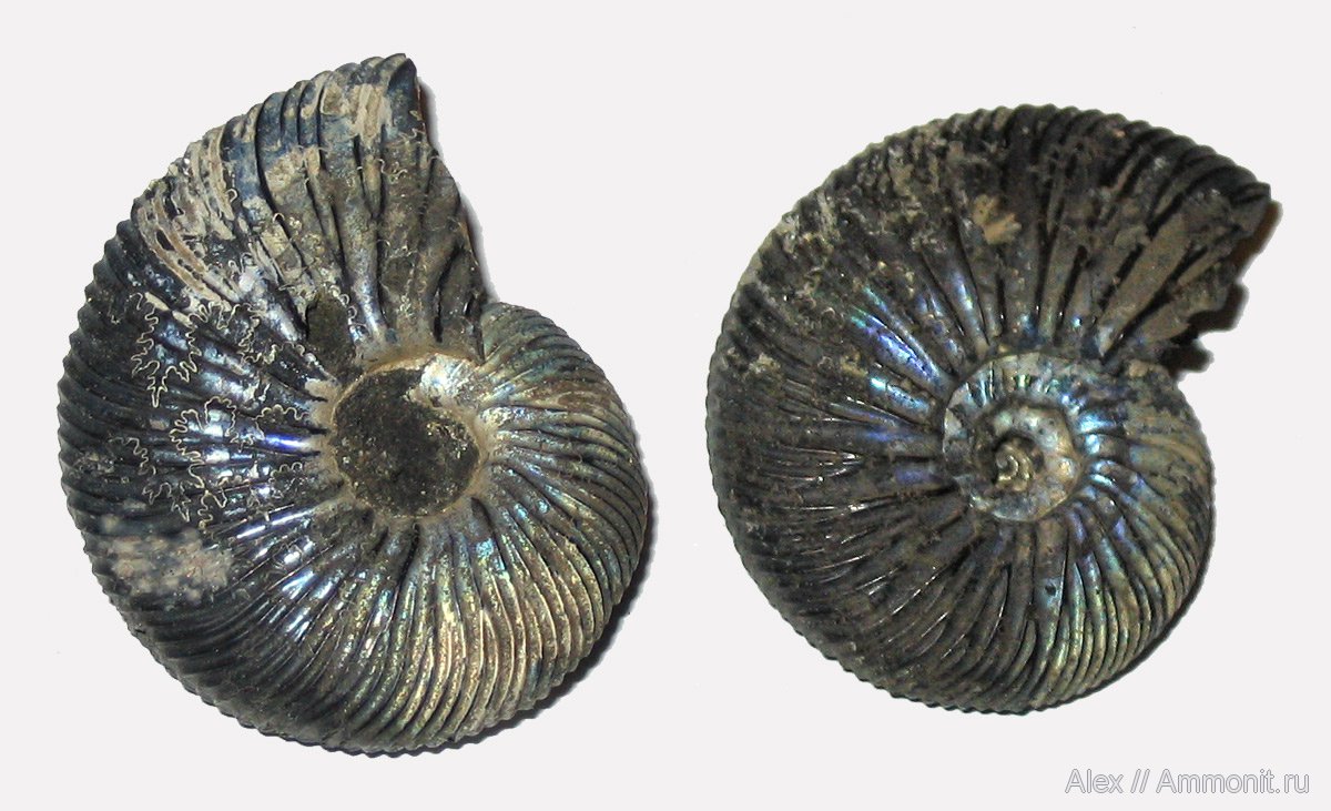 Небольшие аммониты с частично сохранившимся перламутром на раковине. Хорошо видна лопастная линия - вдоль нее с внутренней стороны к раковине крепятся перегородки. Как правило, именно по этим линиям разваливаются окаменевшие раковины в отвалах.