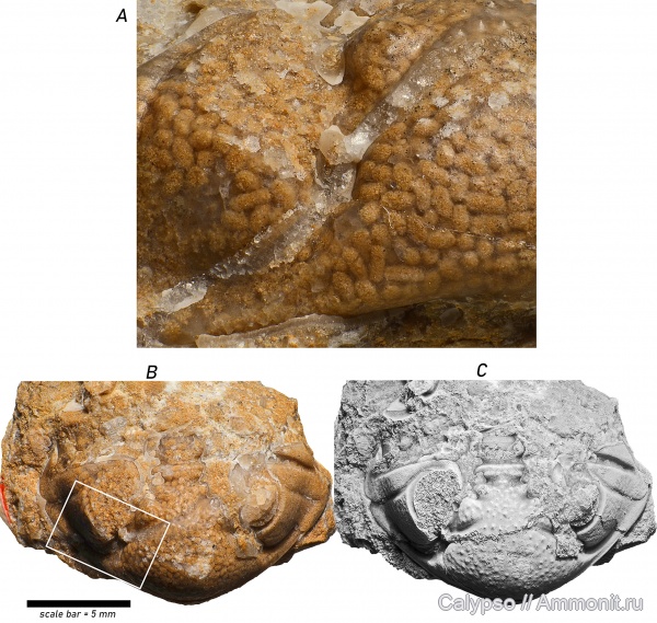 На сборном снимке цефалон Estoniops exilis (Eichwald, 1840). Представлен большей частью объёмным слепком внутренней поверхности панциря, который был утрачен при раскалывании породы.