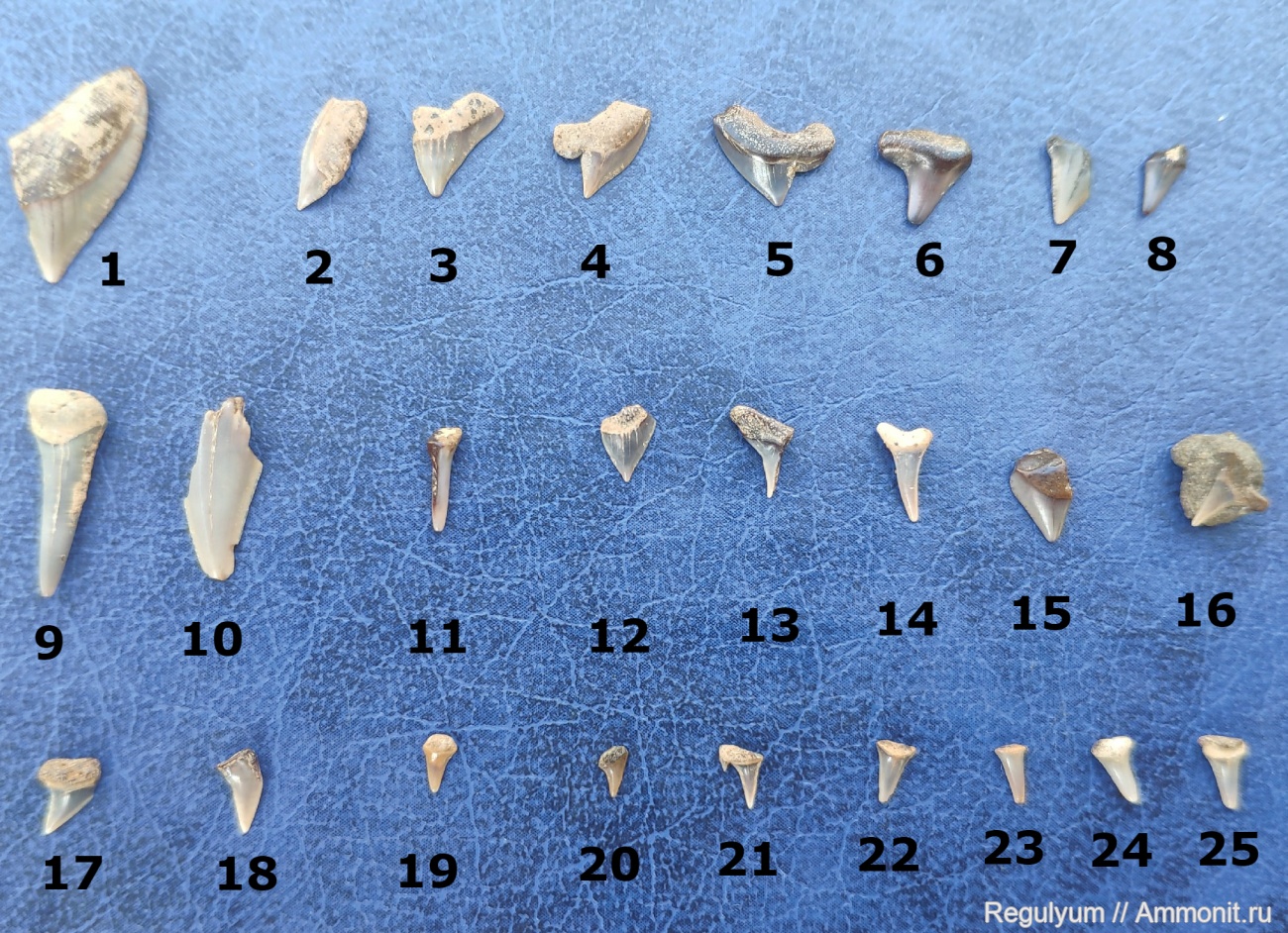 Верхний ряд -- с 1 по 5, думаю, скваликораксы, 12 тоже вроде он. Остальное сильно фрагментировано, но по аналогии с нашим мелом должны быть археоламны и эостриатолямии.. | ||||||
