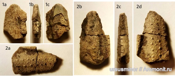 1 - неполная ладонь левой клешни; a - верхняя сторона, b - внешний боковой край, c - нижняя сторона; на всех фото она обращена передом вниз. Интересно, что на той части ее нижней стороны, где ободрался панцирь (т. е. на ядре клешни) расположены крупные бугорки, в то время как сам панцирь снаружи гладкий, лишь в мелких пунктациях, которые расположены поперечными рядами.