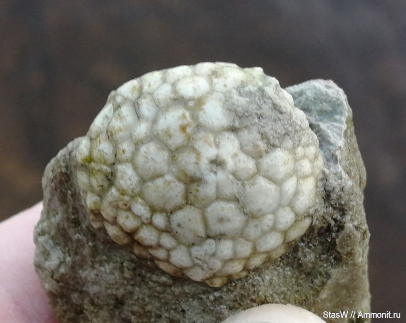 Интересный экземпляр: из азери (кунды?), крупные размеры теки и строение дистальных частей амбулакров как у азериского P. fragum, но при этом базальная часть архаичная: относительно крупная фасетка стебля и нет характерного для P. fragum массивного уплощённого "донца", образованного двумя нижними венчиками крупных табличек. | ||||||