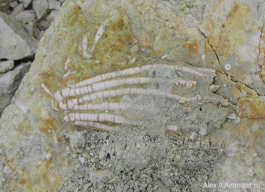 Морская лилия Moscovicrinus multiplex в карьере Цемгигант. Сохранились только руки (брахиоли) морской лилии. Они практически точно соответсвуют "классическому" изображению этого вида в определителе. Хорошо видно, что каждая пара рук растет из одного основания. Ни чашечки, ни стебля от этого экземпляра лилии найти не удалось. Сама лилия сохранилась в зеленоватых глинах кревякинского горизонта касимовского яруса верхнего карбона.