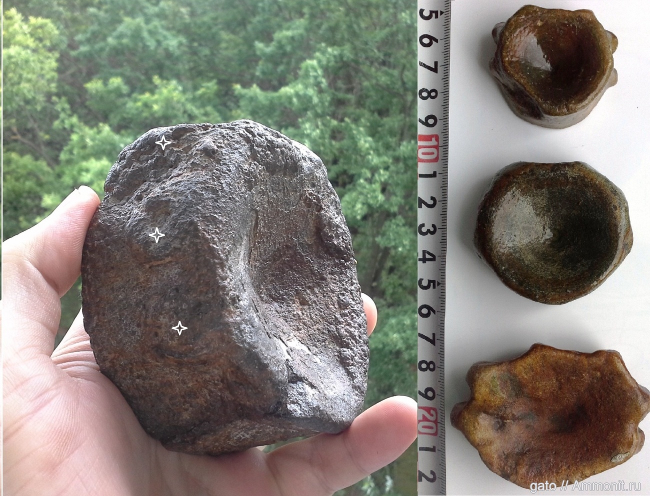 Слева крупный и тяжелый пиритизированный переднетуловищный позвонок ихтиозавра весом почти килограмм. Звездочками отмечены упомянутые бугорки. Кимеридж.