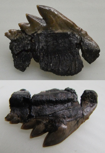 Высота зуба 1,5 см. Длина 2 см. Найден при раскопках ихтиозавра на границе мергелистой глины и битуминозного сланца. Средний подъярус волжского яруса. Зона Dorsoplanites panderi. Уровень В7.