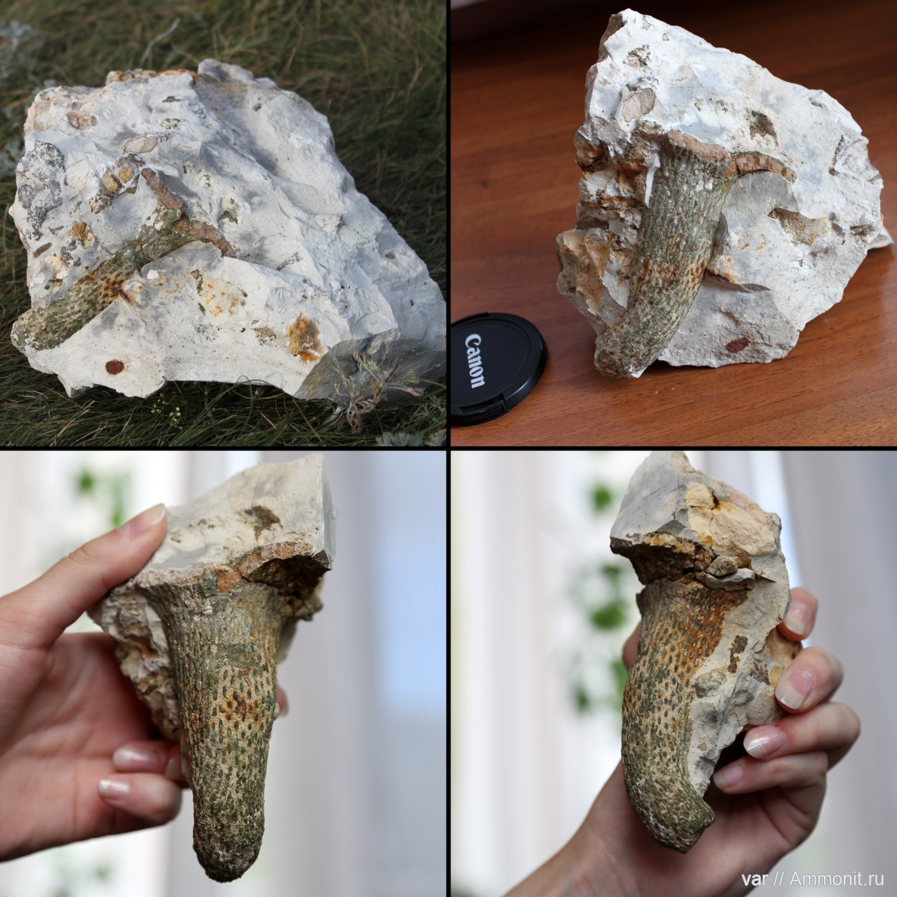 Находка конца августа 2019 г. в районе села Климовка. Результат совместной поездки с уважаемыми Александром (Astrocrocus) и Максимом (Maximus063). Максимальный размер образца около 13 см. Вверху слева первоначальный вид образца. Внизу - результат «препарирования». Благодарю за определение уважаемого khutoryanin'а!