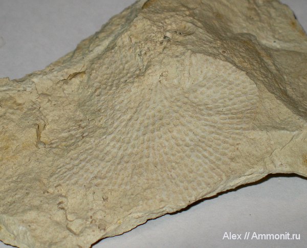 Колония мшанок рода Polypora. Эти мшанки образовывали колонии в виде тонких пластин-листочков с достаточно крупными порами. Они росли на дне, камнях и разнообразных предметах, но не обрастали их, в отличие от многих других мшанок. Одна из таких колоний, практически целая, видна на фотографии. Образец найден в известняках каменноугольного возраста в Голутвинском карьере.