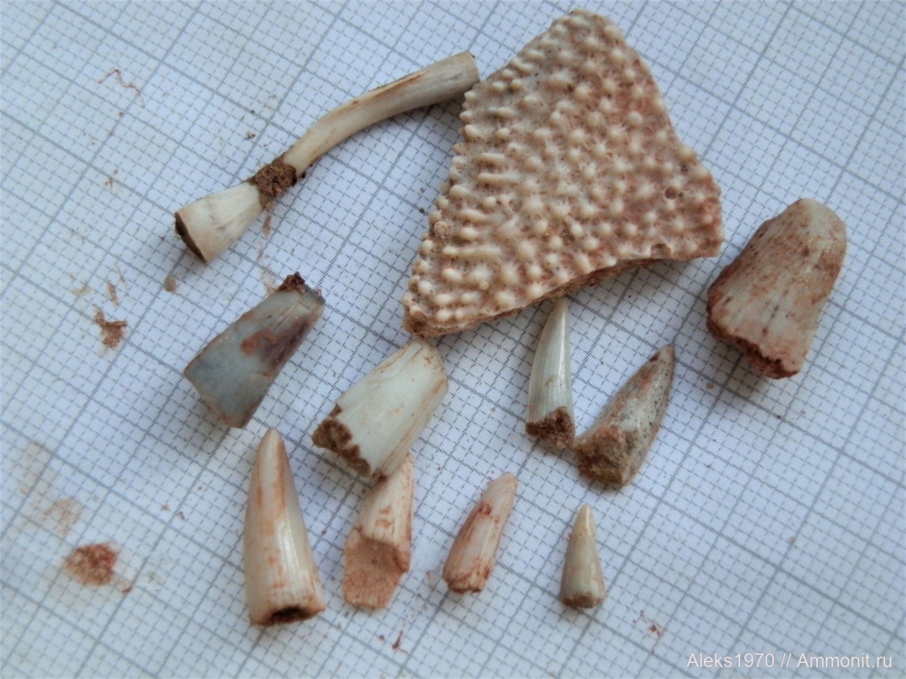 Вот так выглядят вымытые из глины осколки панцирей, а стрелочкой я указал на один из зубиков. Фото сделано на месте в карьере. | ||||||