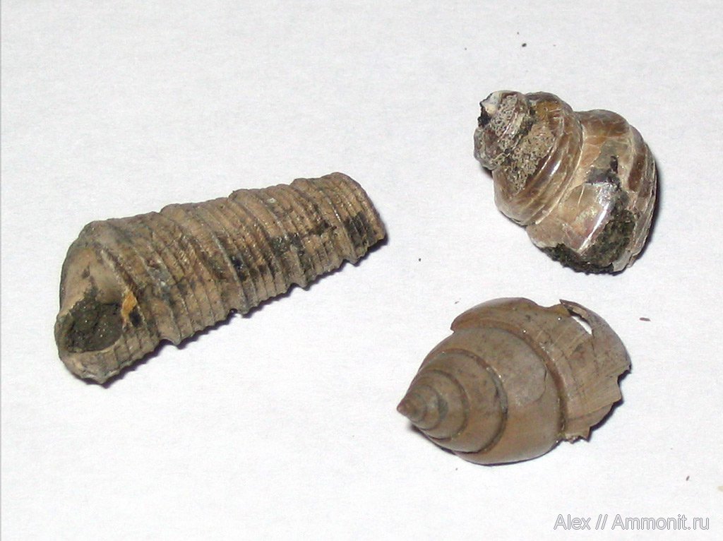 Эти три гастроподы были найдены в юрских отложениях Голутвинского карьера. Одна из раковин обломана примерно на середине, судя по всему изначально она была раза в два длиннее. Вообще эти раковинки очень хрупкие и извлекать их из глины непросто.