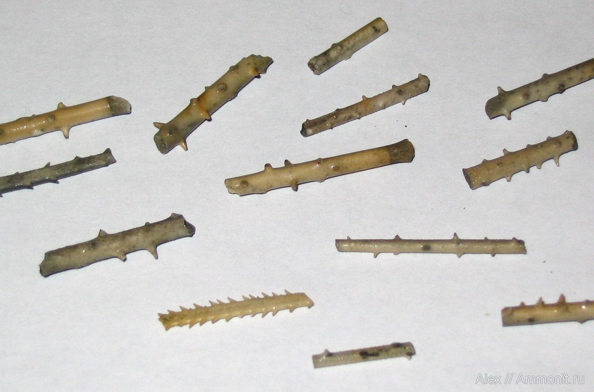 Эти иглы юрских морских ежей найдены в Филевском парке на территории Москвы. Там они встречаются примерно в такой-же численной пропорции как показано на фотографии - одна плоская игла с зазубренными краями на 10-12 цилиндрических шипастых иголок. К сожалению, все иглы поломаны. Но судя по положению фрагментов в породе их длина превышала 10 сантиметров.