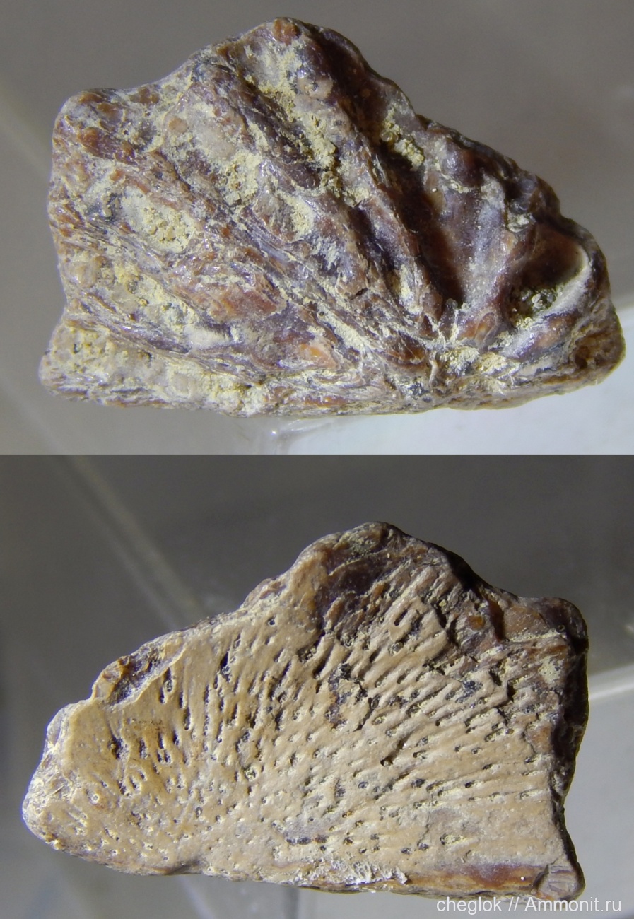 Фоссилия, живо напомнившая мне находки жучков осетров в мелу-кайнозое. Размер около 2 см.