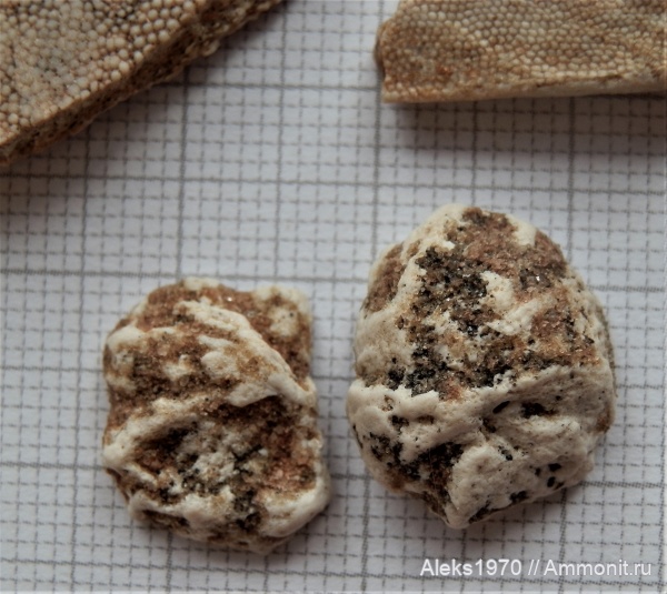Вместе с кусочками панцирей попались два фрагмента похожие на глаза, а может и не глаза. Судя по рисунку на панцире, это бесчелюстная рыба Psammolepis paradoxa. Может есть кто прояснит ситуацию?