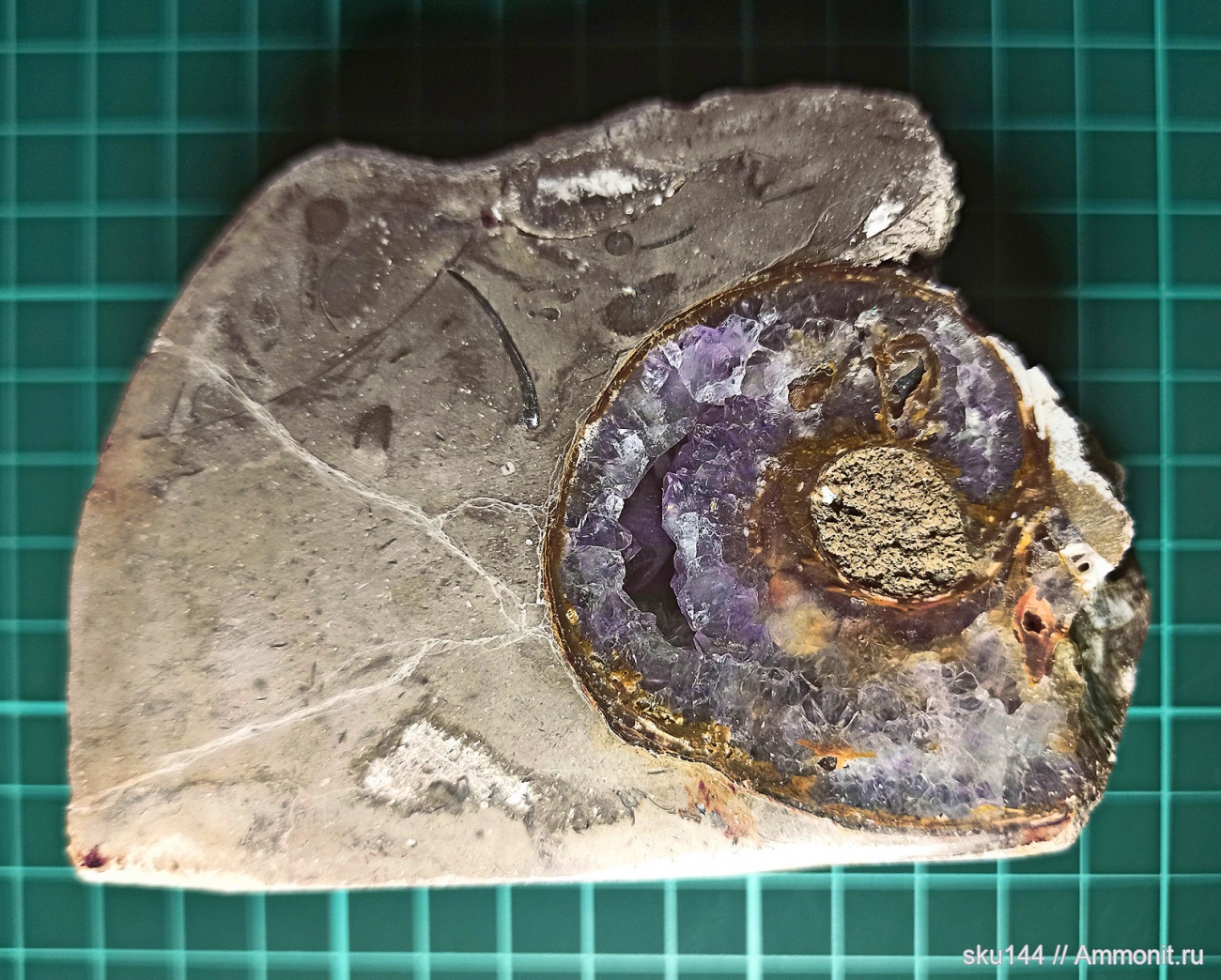 Заканчивая препарировать последние образцы из поездки в Солигалич, (остались самые сложные и внешне не очень презентабельные) решил не мучаться с этим образцом, а резануть его, чтобы посмотреть на внутренности. Повезло, мой первый наутилус с аметистом!