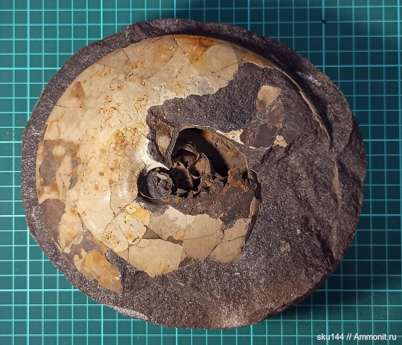 Аммонт в фосфорите из гравийного карьера, 21см в диаметре. Внутри пустой, обычно они раскалываются поперёк, но здесь кувалда удачно попала на ребро.