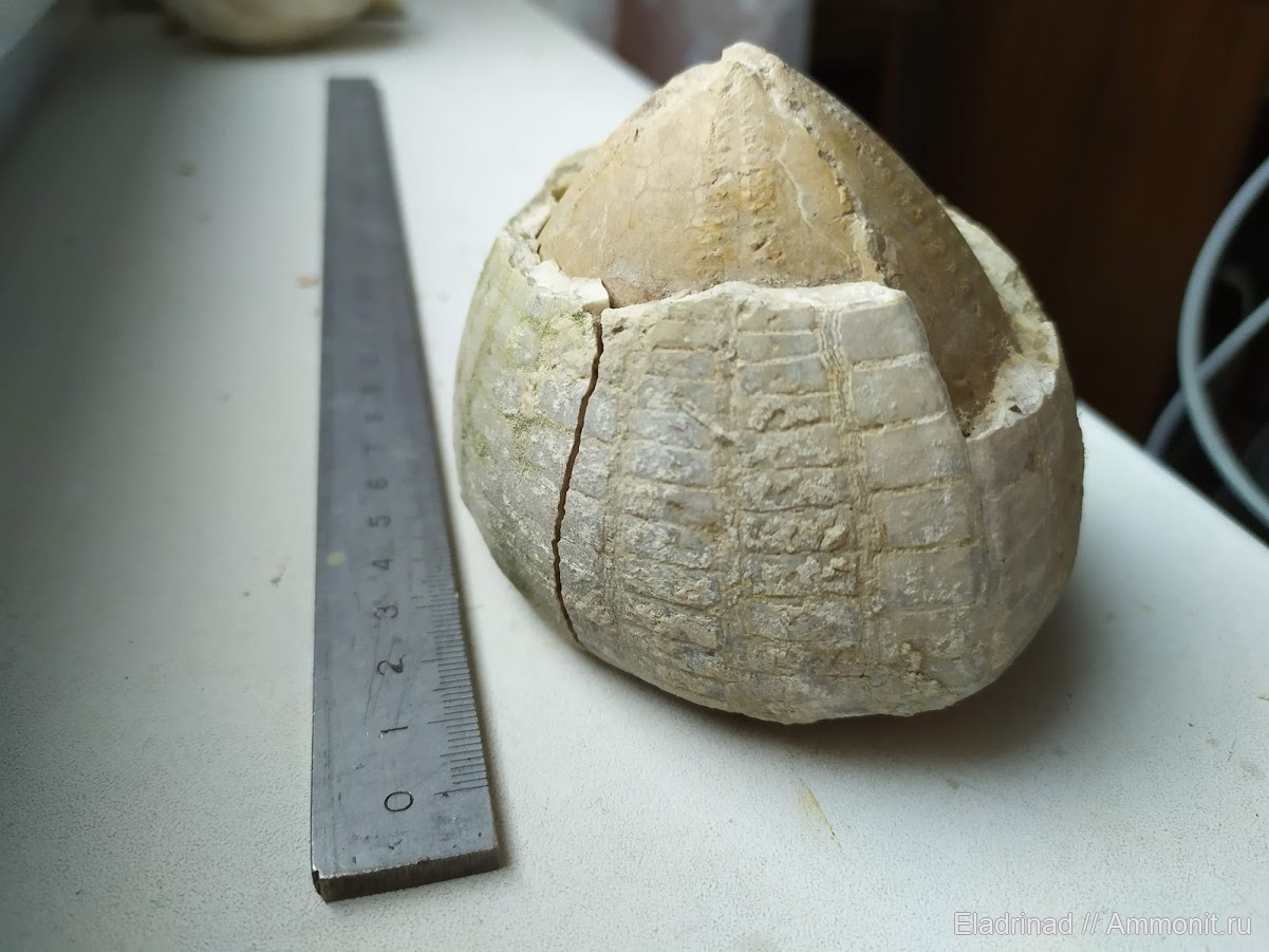 Нашёл практически без панциря, панцирь затем отыскал в районе нескольких метров. Видимо раскололся, когда падал с отвала. Верхушка до сих пор не найдена.