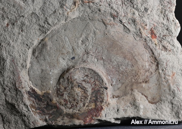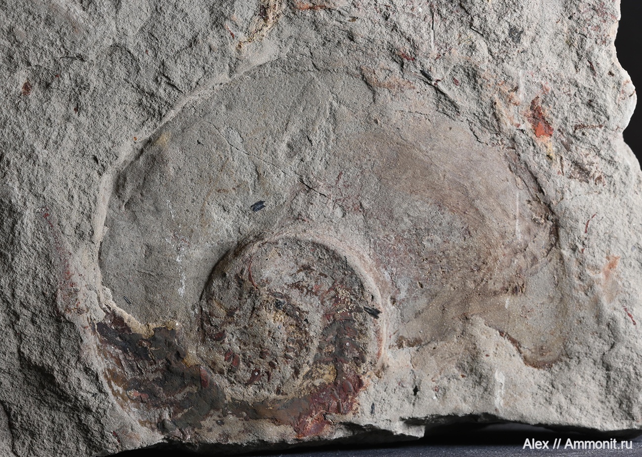 В отличие от трехмерных пиритовых ядер головоногих в стешевских глинах, в прослоях доломитового алевролита раковины сохраняются в раздавленном и растворенном виде. Такие находки не очень красивы, но все-таки интересны. На этом фото Catastroboceras из алевролита, на фрагмоконе видны следы пиритизации. Интересно, что фрагмокон имеет диаметр всего 4 см, а вместе с жилой камерой наутилус оказывается 7 см в диаметре.