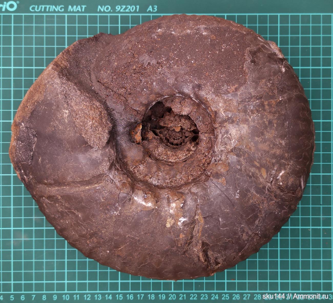 Ещё один жирнючий аммонит. Порода вокруг на удивление легко отошла, редко такое случается. Пупок закономерно разрушен, т.к. внутри он пустой.