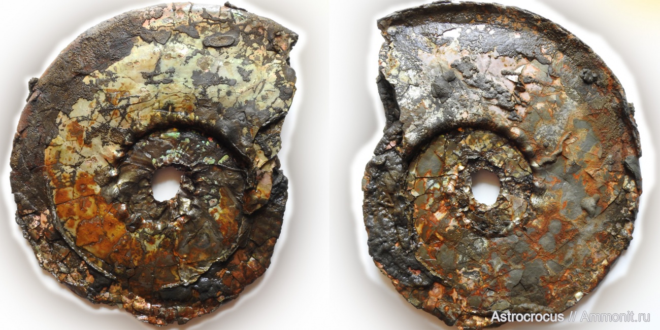 Не очень крупный, расплющенный, пиритовый, с остатками перламутра Aspidoceras.