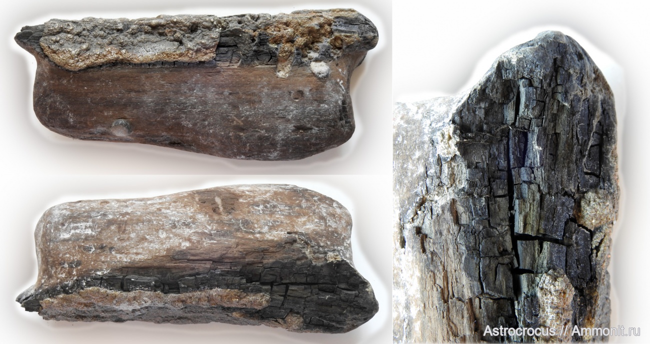 Обломок окаменевшего дерева фосфоритизированный, обугленный скраю. По обугленной поверхности пиритовая корка. Имеются следы работы древоточцев.