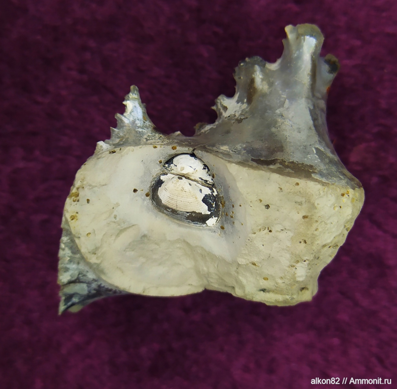 Попался грязный, местами развалившийся фрагмент аммонита, скорее всего, euaspidoceras или peltoceras, так как один шип у него есть? А в нём пристроился какой-то Grammatodon. Помыл, склеил и расчистил.