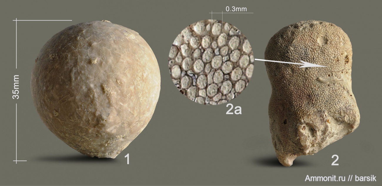 Слева небольшая цистоидея Echinosphaerites из Вильповиц, справа, наверное мшанка, такого же размера, Клясино. По центру фрагмент текстуры крупно.