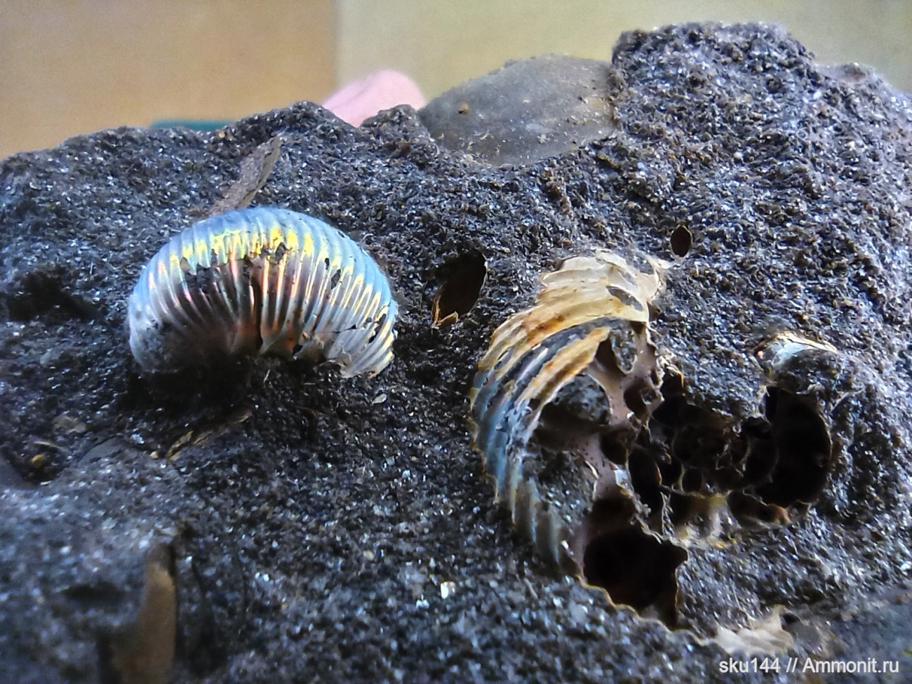 Уникальный аммонит с точки зрения наличия перламутра. На больших аммонитах из конкреций он встречался очень редко, и покрывал лишь небольшие области. Размером 2 см. Переливы цвета удалось поймать только на макро. Немного другой ракурс.